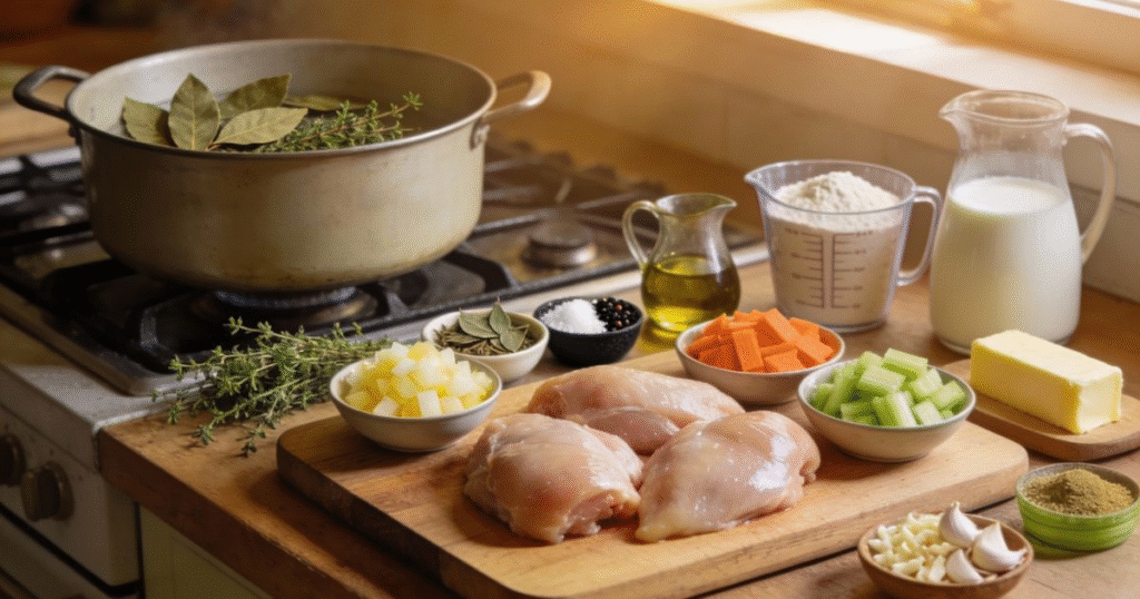 Sprinkle the flour over the vegetables and stir constantly for 2 minutes, coating everything evenly. This creates a roux that will thicken your broth into that signature creamy consistency. Gradually pour in the chicken broth, whisking constantly to prevent lumps from forming. The mixture will seem thin initially but will thicken as it simmers. Add the bay leaves, thyme, sage, celery salt, and additional salt and pepper to taste.
