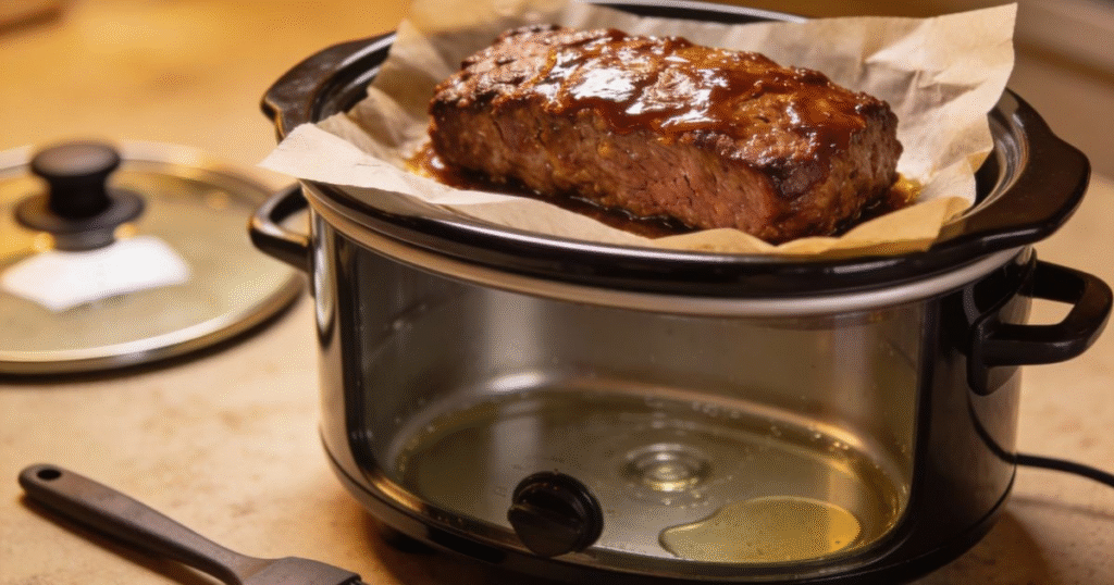 Add ¼ cup of water to the bottom of the slow cooker. Lower the meatloaf carefully into the cooker.