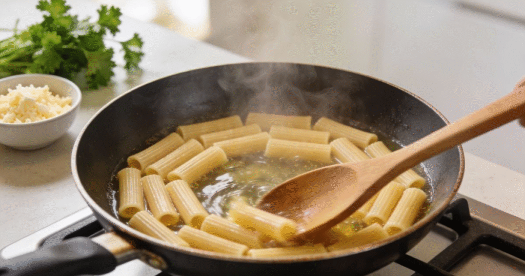 Add the uncooked pasta directly to the skillet with the broth. Arrange the pasta in an even layer so it cooks uniformly.