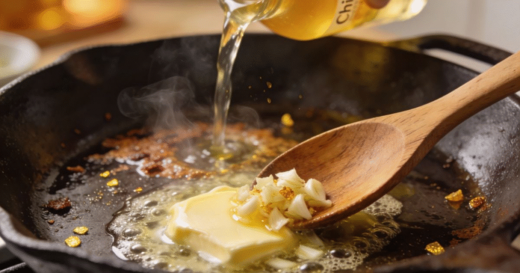Lower the heat to medium and melt the butter in the same skillet.Let it melt completely without burning.