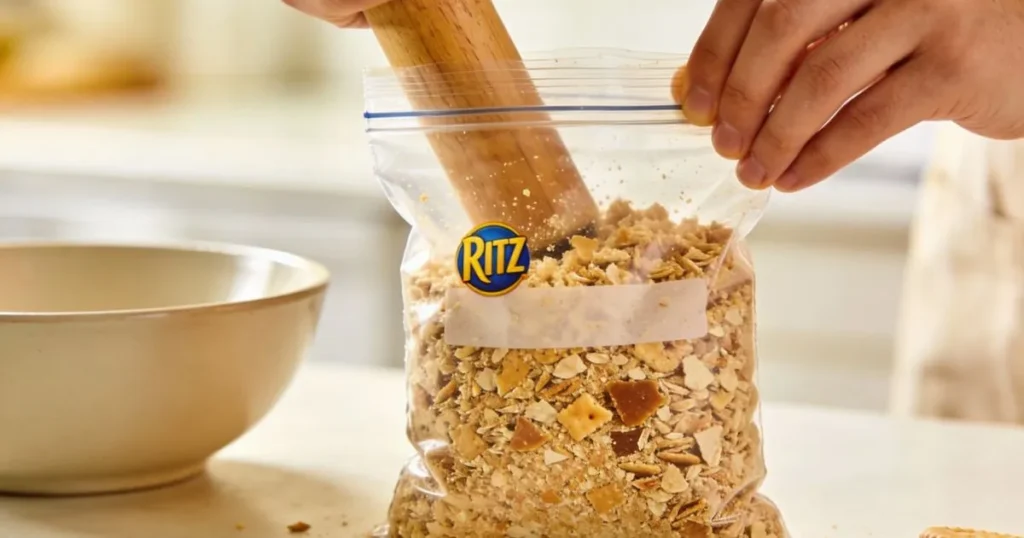 Place Ritz crackers in a zip-top bag and crush them with a rolling pin until fine. You want small crumbs, not powder. This texture helps bind the meat without making it dense.