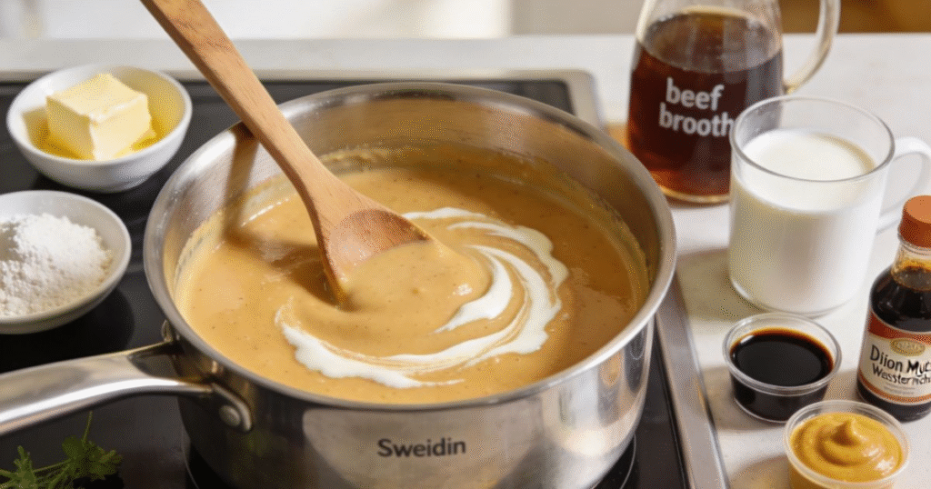 In a medium saucepan over medium heat, heat the butter until it starts to foam.Whisk in the flour and cook for 1-2 minutes, stirring constantly to create a golden roux—this removes the raw flour taste and creates the foundation for your silky sauce. Slowly whisk in the beef broth, stirring constantly to prevent lumps. Bring to a gentle simmer, then reduce heat to low and stir in the heavy cream, soy sauce, Worcestershire sauce, Dijon mustard, and black pepper. Allow the sauce to simmer for 3–4 minutes until it slightly thickens and coats the back of a spoon.